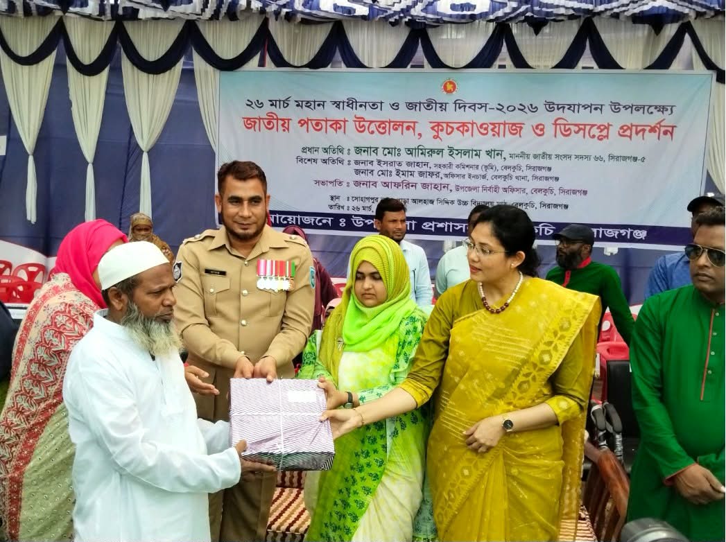 সিরাজগঞ্জের বেলকুচিতে যথাযথ মর্যাদায় উপজেলা প্রশাসন কর্তৃক ২৬ শে মার্চ মহান স্বাধীনতা ও জাতীয় দিবস উপলক্ষে সকাল ০৬•০১মিনিটে উপজেলা শহীদ মিনারে শহীদদের শ্রদ্ধা নিবেদনে স্তবকধনী, পুষ্পস্তবক অর্পণ,জাতীয় পতাকা উত্তোলন, কুচকাওয়াজ ও ডিসপ্লে প্রদর্শন ও চিত্রাঙ্কন প্রতিযোগিতায় অংশগ্রহনকারী ছাত্র ছাত্রীদের মাঝে পুরস্কার বিতরণ করা হয়েছে।
